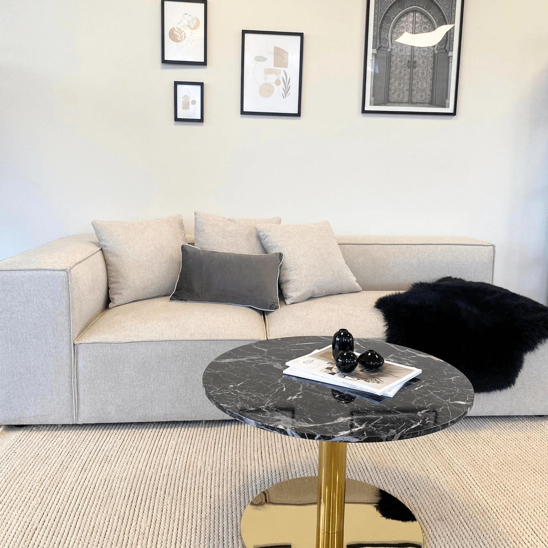 Lazio pyöreä sohvapöytä mustassa marmorilookissa, jossa on kultaiset jalat, sopii erinomaisesti olohuoneen sisustuksen keskeiseksi keskipisteeksi.