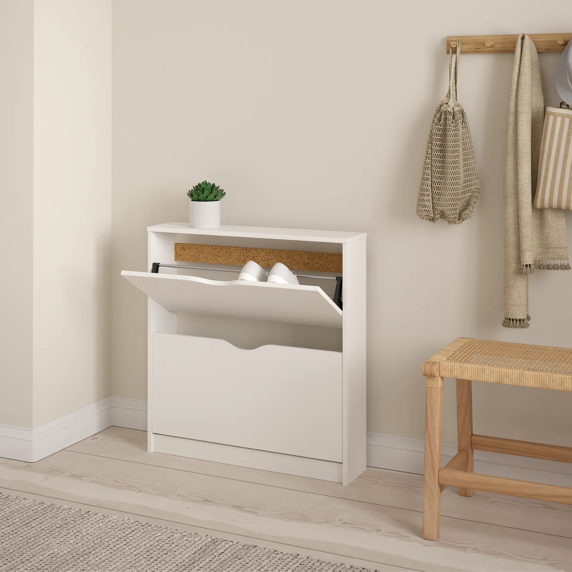 Kenkäkaappi takaa kahdella lokerolla, että kenkäsi pysyvät järjestyksessä ja helposti saatavilla. Modernissa ja yksinkertaisessa muotoilussa yhdistyvät sekä toiminnallisuus että ulkonäkö, joten se on täydellinen valinta mihin tahansa eteiseen, käytävään tai vaatehuoneeseen