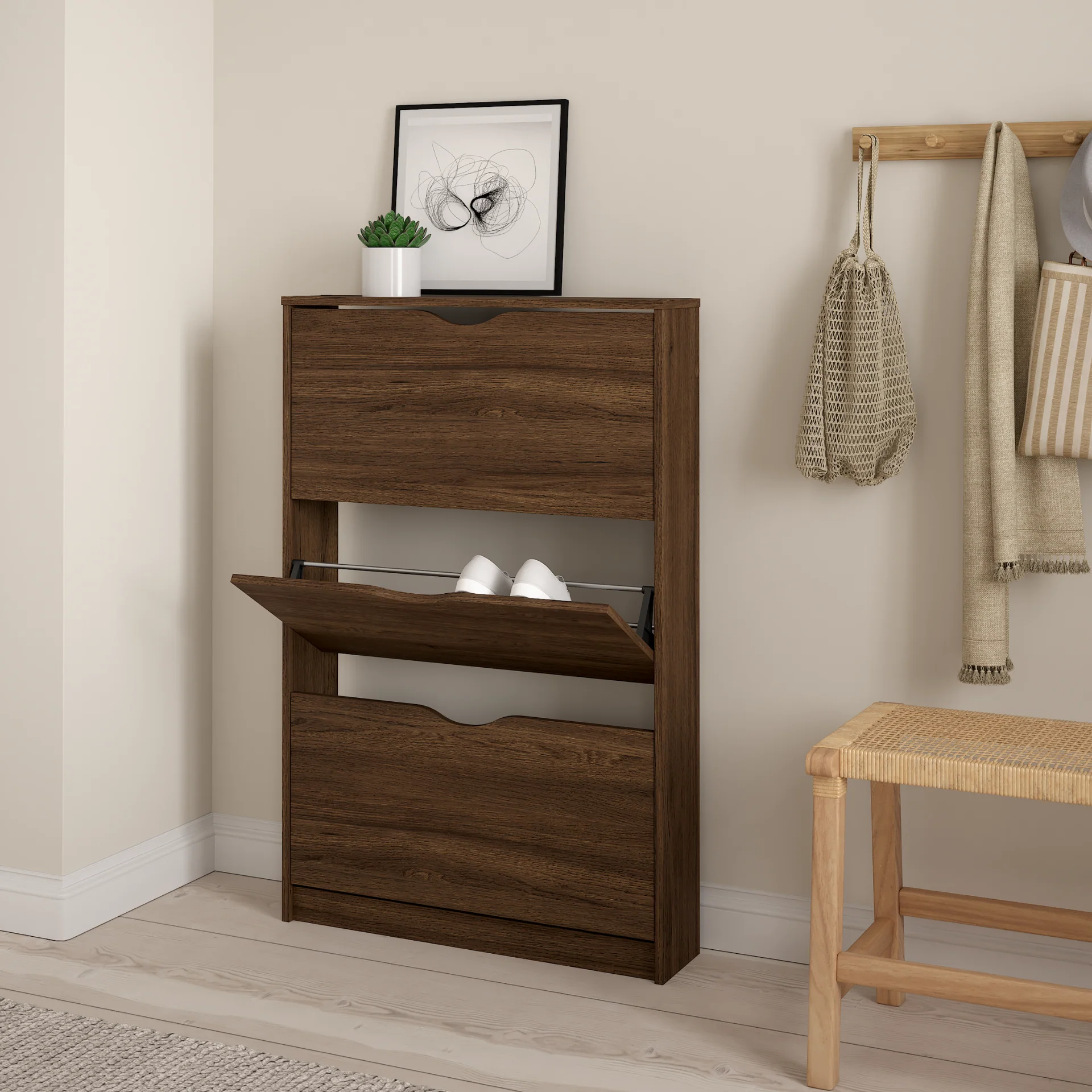 Kenkäkaappi takaa kolmella tilavalla säilytyslokerolla, että kenkäsi pysyvät järjestyksessä ja helposti saatavilla. Modernissa ja yksinkertaisessa muotoilussa yhdistyvät sekä toiminnallisuus että ulkonäkö, joten se on täydellinen valinta mihin tahansa eteiseen, käytävään tai vaatehuoneeseen