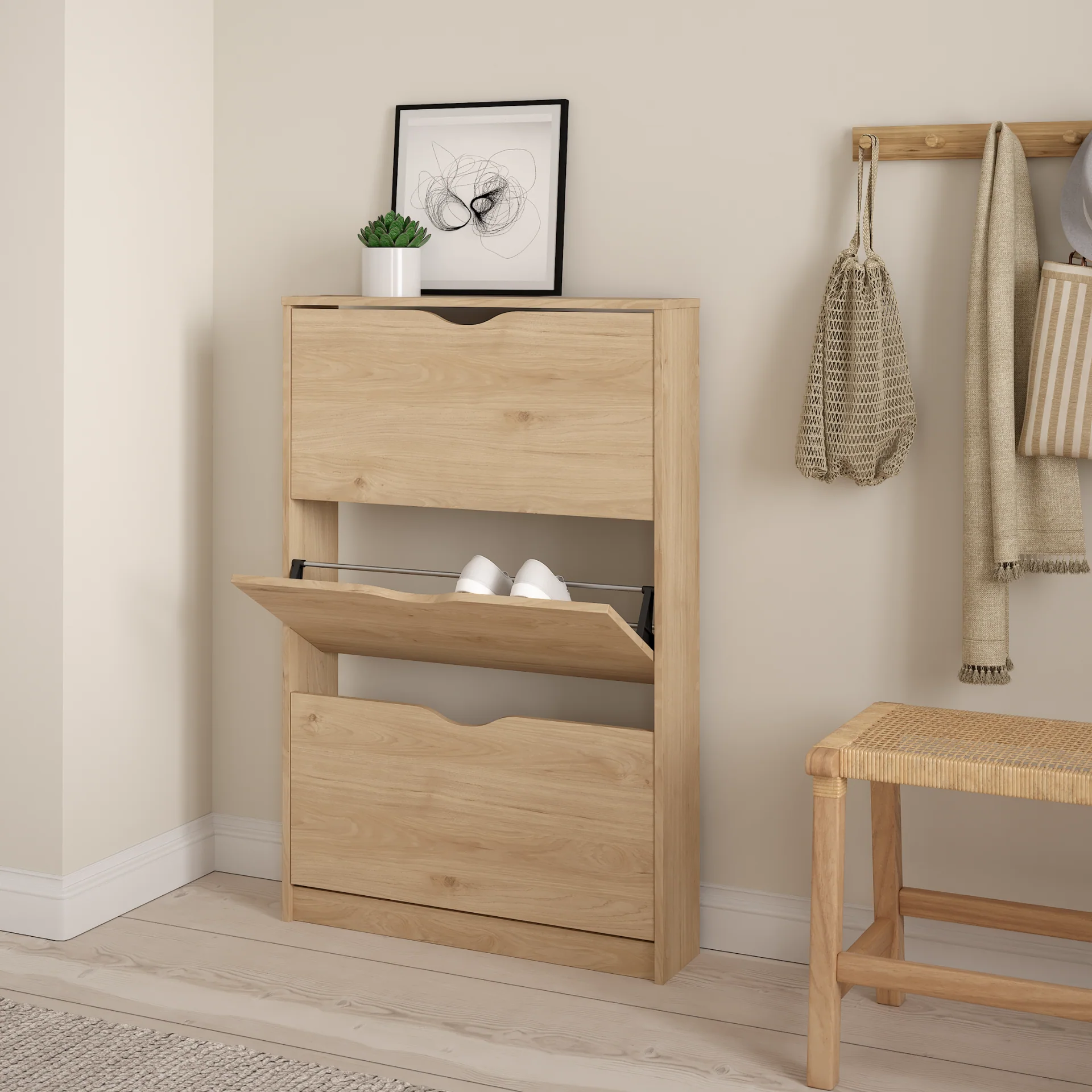 Kenkäkaappi takaa kolmella tilavalla säilytyslokerolla, että kenkäsi pysyvät järjestyksessä ja helposti saatavilla. Modernissa ja yksinkertaisessa muotoilussa yhdistyvät sekä toiminnallisuus että ulkonäkö, joten se on täydellinen valinta mihin tahansa eteiseen, käytävään tai vaatehuoneeseen