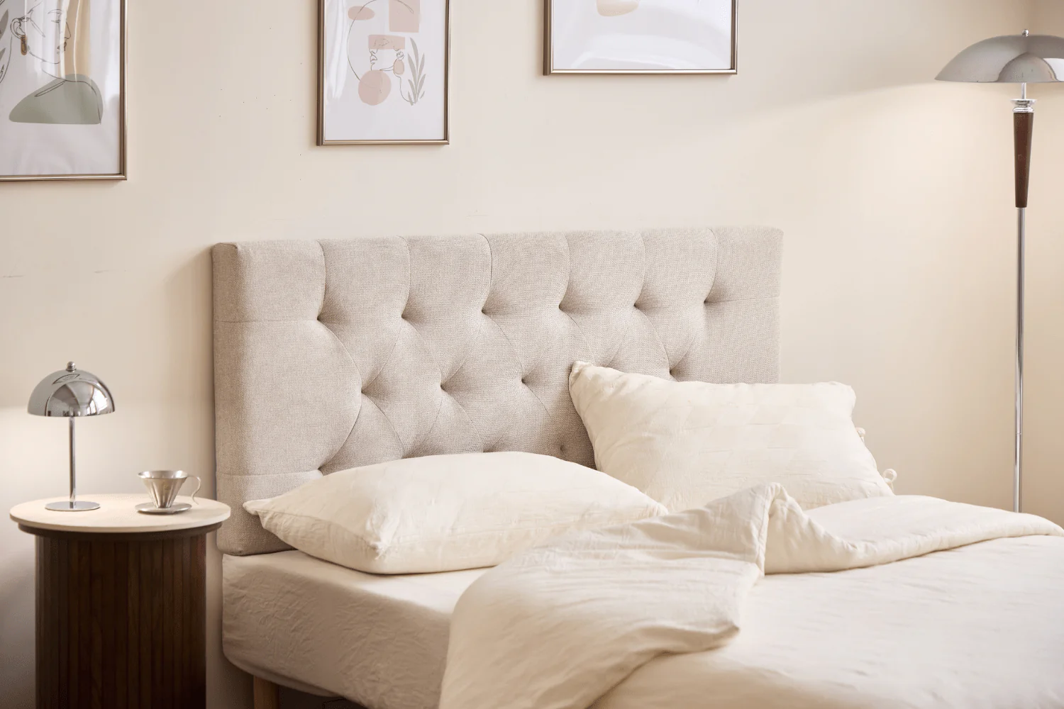 Tämä kaunis, beigeä tekstiiliä oleva sängynpääty tuo makuuhuoneeseesi tyylikkään ja ajattoman säväyksen. Herkkien tuftattujen yksityiskohtiensa ansiosta se luo hienostuneen ilmeen, joka sopii täydellisesti sekä moderniin että klassiseen sisustustyyliin.