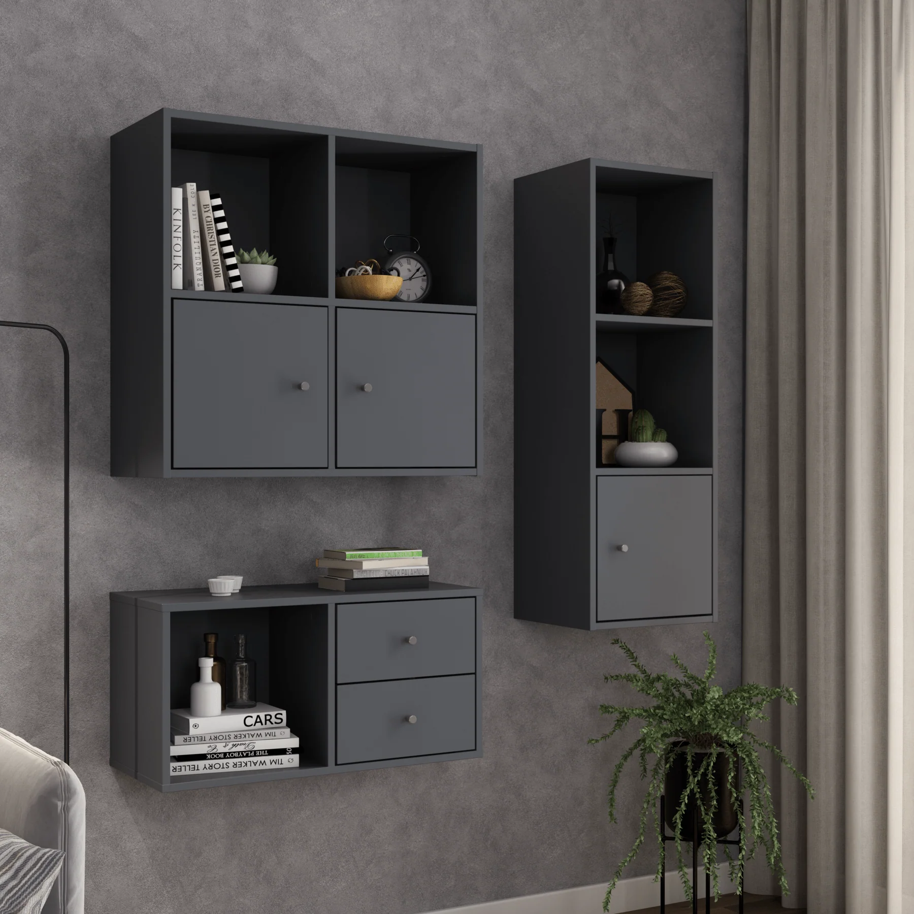 Hyllyjärjestelmän harmaat ovet